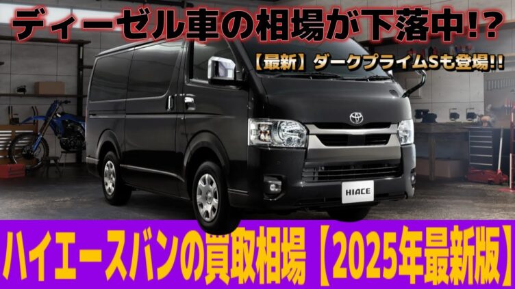 Youtube 【ディーゼル相場が下落中!!】ハイエースバンのリセールバリューと買取相場を調べたらガソリン車の残価率がエグすぎた!2025年最新版 受注が再開されたトヨタ・ハイエースバンの業者オークションの相場を徹底調査しました。新型車『ダークプライム S』の登場でディーゼル車の相場が下落中!一方でガソリン車の残価率が凄いことに。さっそく業者オークションに『ダークプライム S』が出品さ... 2025.09.25 Youtube